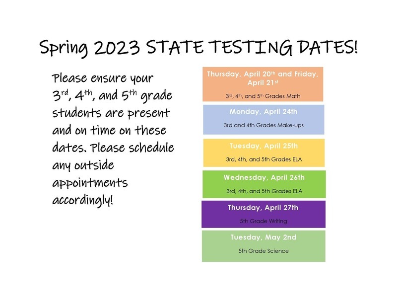 State testing is right around the corner! State testing is for students in 3rd through 5th grade . Please schedule appointments around testing days. For more information you can contact your child's teacher.